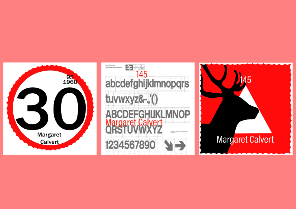 1957 wurde Kinneir zum Leiter der Schilder für Großbritanniens Straßen ernannt. Er beauftragte Calvert dann, das Straßenschildsystem neu zu gestalten, und sie entwickelte einfache, leicht verständliche Piktogramme, darunter die Schilder für „Männer bei der Arbeit“ (ein Mann, der gräbt), „Bauernhoftiere“ (basierend auf einer Kuh namens Patience, die auf einem Bauernhof in der Nähe ihres Aufwachsens lebte) und „Schulkinder in der Nähe“ (ein Mädchen, das einen Jungen an der Hand anführte, von dem sie sagte, dass sie tatsächlich nach sich selbst modelliert wurden), mit Hilfe des europäischen Protokolls. Das Worboys Committee wurde im Juli 1963 von der britischen Regierung gegründet, um die Beschilderung auf allen britischen Straßen zu überprüfen. Zusätzlich zu ihren Straßenschildern hat Calvert kommerzielle Schriften für Monotype entworfen, darunter die gleichnamige Calvert-Schriftart, ein Plattenserifendesign, das sie 1980 kreierte.