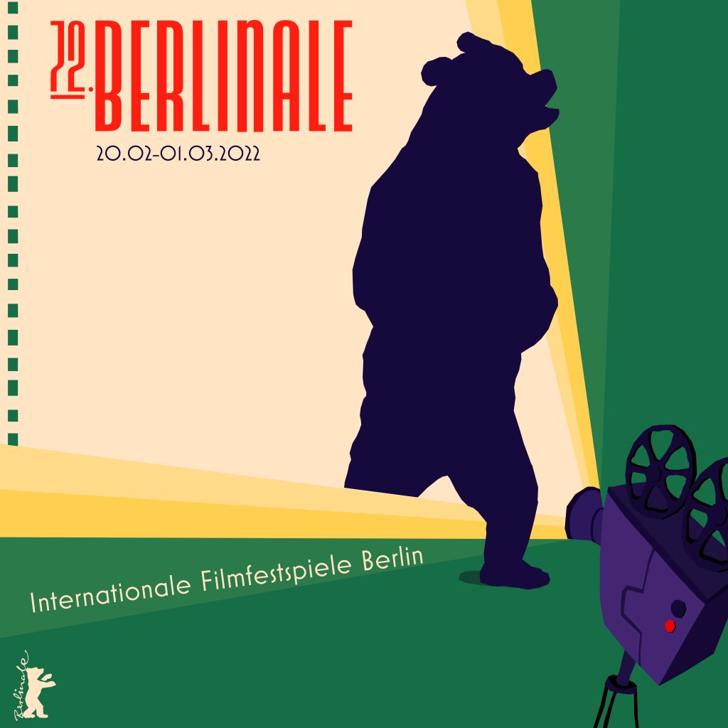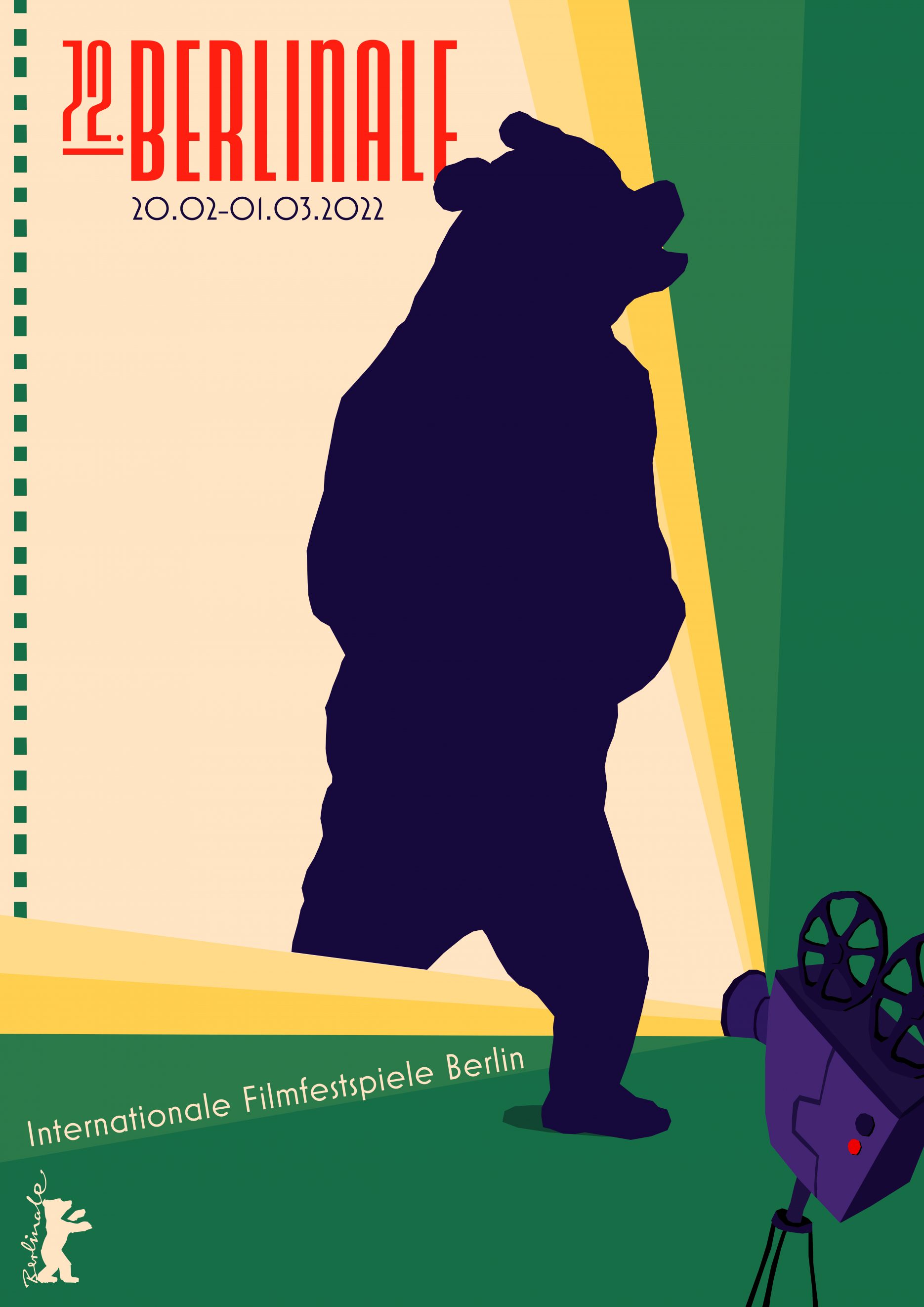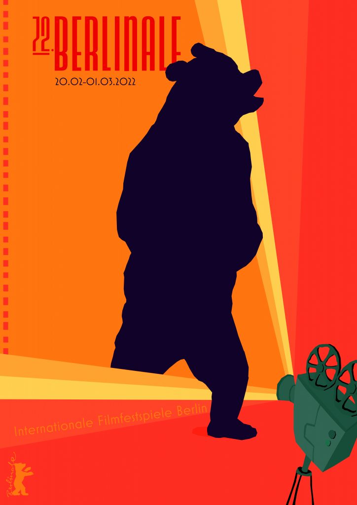 Die Ideenfindung bei dieser Aufgabe viel mir schwer. Ich habe mich an Objekten aus dem Filmdreh bedient und zwar den Filmprojektor und den analogen Filmstreifen. Einbauen wollte ich unbedingt einen Bären. Mit Impulsen von Außen kam ich dann auf die Idee, ein Schattenspiel im Cut-Out Stil mit knalligen Farben und im Retro Look zu gestalten. Ich habe ausschließlich mit Illustrator gearbeitet.